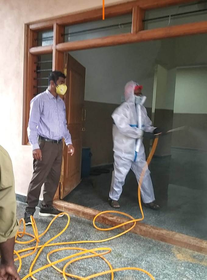 ಕ್ವಾರೆಂಟೈನ್‌ ಕಟ್ಟಡಕ್ಕೆ ಔಷಧಿ ಸಿಂಪಡಿಸುತ್ತಿರುವ ಪೌರ ಸಿಬ್ಬಂದಿಗಳು