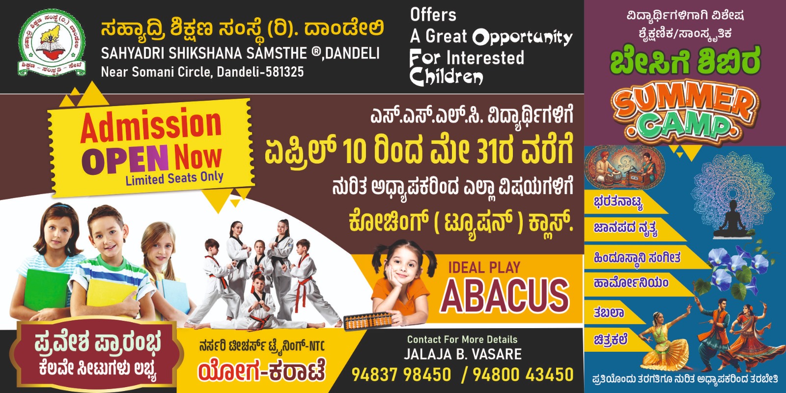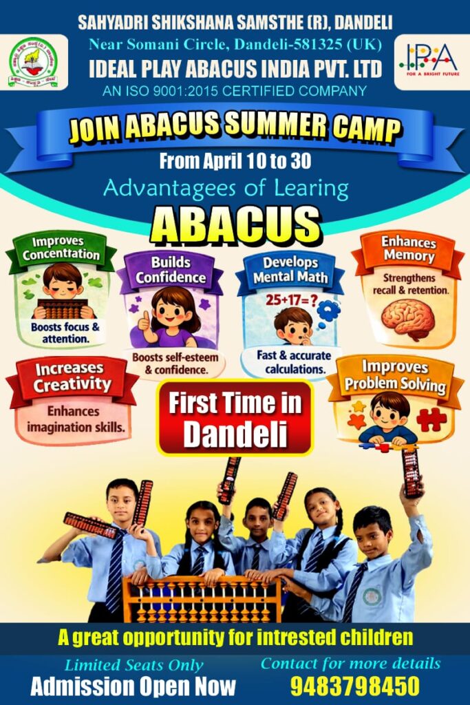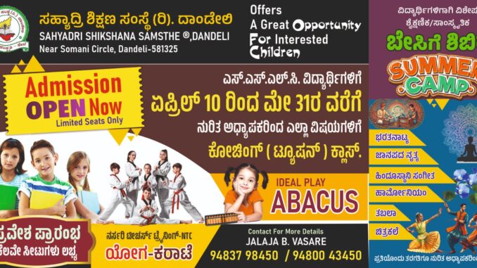 ದಾಂಡೇಲಿಯ ಸಹ್ಯಾದ್ರಿ ಶಿಕ್ಷಣ ಸಂಸ್ಥೆಯ ಆಶ್ರಯಯದಲ್ಲಿ ದಾಂಡೇಲಿಯಲ್ಲಿ ಎಪ್ರಿಲ್ 11 ರಿಂದ ಮೇ 30 ರ ವರೆಗೆ ವಿವಿಧ ಶೈಕ್ಷಣಿಕ ಹಾಗೂ ಸಾಂಸ್ಕೃತಿಕ ಬೇಸಿಗೆ ಶಿಬಿರ ನಡೆಯಲಿದೆ.
