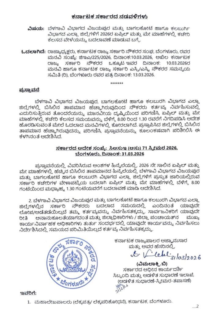 ಬೆಳಗ್ಗೆ 8 ರಿಂದ ಮಧ್ಯಾಹ್ನ 1:30ರ ತನಕ ಸರ್ಕಾರಿ ಕಚೇರಿಗಳ ಕೆಲಸದ ಸಮಯ ನಿಗದಿ ಮಾಡಿದ್ದು, ಏಪ್ರಿಲ್, ಮೇ ತಿಂಗಳ ಅಂತ್ಯದವರೆಗೆ ಸರ್ಕಾರಿ ಕಚೇರಿ ಸಮಯ ಬದಲಾವಣೆ ಜಾರಿಯಲ್ಲಿ ಇರಲಿದೆ.